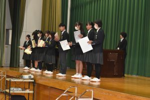 さらに、本校卒業生である坂口先生が、体を守るはたらきを調整する制御性T細胞を発見され、病気の治療に役立つ研究を続けてこられたことについてもお話がありました。世界中の人のためになる研究を長年続けてきたことが高く評価され、ノーベル賞受賞につながったそうです。「皆さんもぜひ頑張ってほしい」という温かいエールもいただきました。