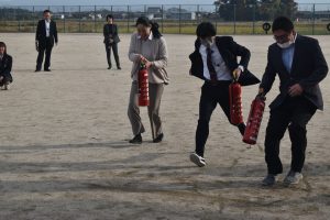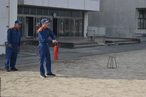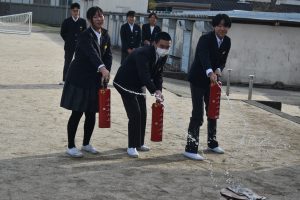 その後は、消火器の安全で正しい使い方を学ぶ訓練を行い、生徒だけでなく教職員も一緒に体験しました。実際に操作してみることで、もしもの際にどのように行動すべきかをより具体的に理解する良い機会となりました。