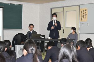 本日、浅井東診療所 所長の松井善典先生、介護施設で看護師として勤務されている金森様、そして滋賀医科大学の学生の皆さんをお迎えし、「がんと共に生きる時代の生き方と考え方」と題して、2年生を対象にがん教育の授業をしていただきました。