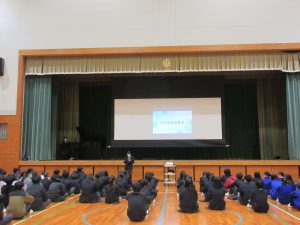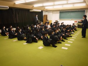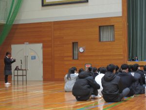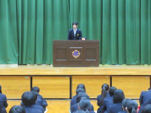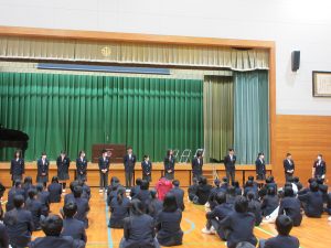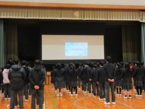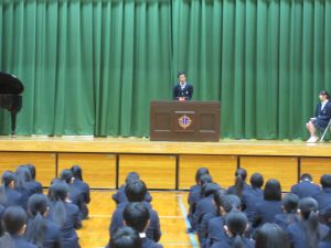 また、本日5校時には、新生徒会による第1回生徒集会が行われました。はじめに全校生徒で校歌を歌い、続いて、本校に受け継がれている「やさしさの空間宣言」を全校生徒で唱和し、一人一人が大切にしたい思いを心に刻みました。