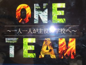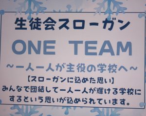 その後、生徒会活動の方向性を示すスローガンと、本部の活動方針が発表されました。新スローガンは「ONE TEAM ~一人一人が主役の学校へ~」です。