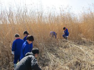 2月17日(火)、延期となっていた1・2年生による「枯れヨシ刈り」を実施しました。これは、本校伝統の「ヨシ行けどんどん作戦」における、1年間のヨシ育成の締めくくりとなる大切な活動です。