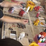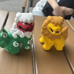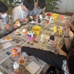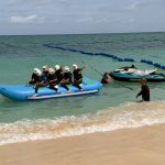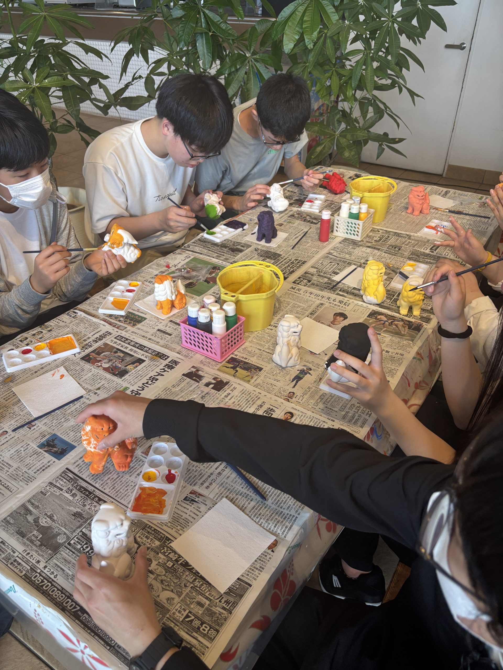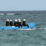天候が心配されましたが、子どもたちの行いの賜物か、急速に回復し、無事に予定通り実施しています。文化体験もとんぼ玉のストラップ作りと本格的なシーサーの色付け体験を行なっています。またマリン体験もシュノケーリングとバナナボートを満喫しています。
